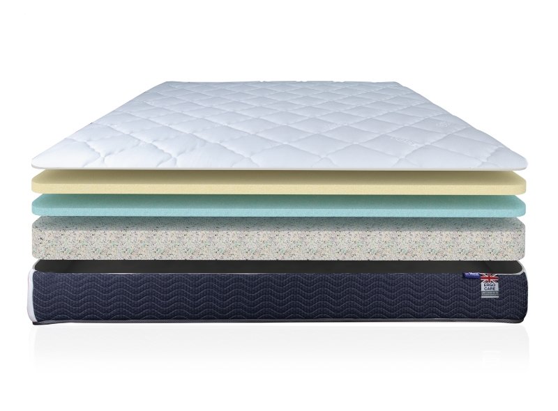 Vono Ergo Care is specially designed for Ergonomic Support. With natural latex and high-quality density foam layer, it is specially designed to support your spine as an Ergonomic concept. The Two-Tone White and Navy Blue design is the identity of Vono. The special imported Sanitized Actifresh coated Vono Knitted Fabric, prevents bacteria, mold and dust mites, giving you a good night's sleep.