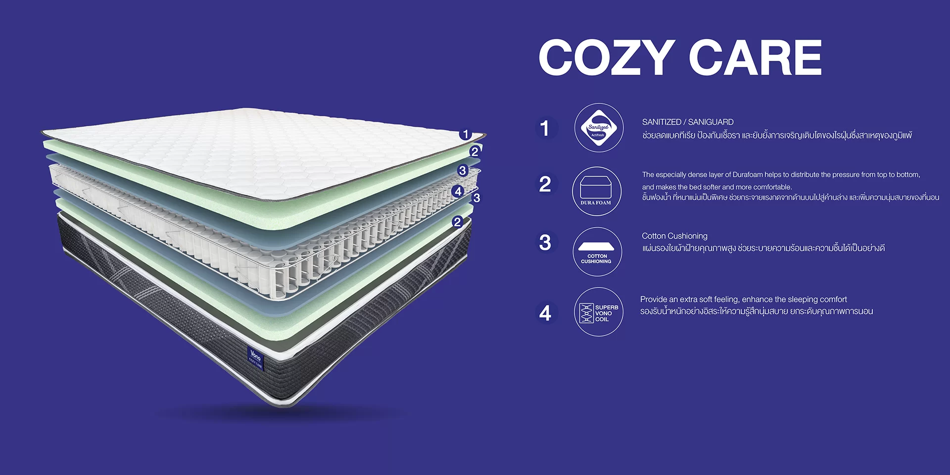 ที่นอน Vono Cozy Care ออกแบบมาให้ความรู้สึกนุ่ม เพิ่มการรองรับน้ำหนักเป็นพิเศษด้วยระบบสปริงเฉพาะพิเศษ Superb Vono Coils ให้เพิ่มความสบายในเวลานอนของคุณโดยไม่ทำให้กระทบกระเทือนคนนอนข้างๆ ผ้าหุ้มคุณภาพดีนำเข้าจากต่างประเทศ Vono Knitted Fabric ปกป้องด้วย Sanitized Actifresh ป้องกันแบคทีเรีย เชื้อรา และไรฝุ่น โดยออกแบบเป็น Pillow Top 2 ด้านเพื่อเพิ่มความสบายและความหรูหรา และยืดอายุการใช้งาน