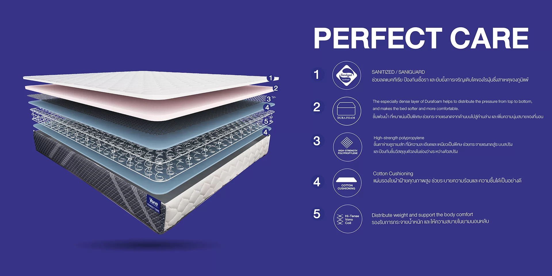 Vono Perfect Care ด้วยการออกแบบร่วมสมัยที่คงความรู้สึกนุ่มเป็นพิเศษเพิ่มความสบายในการนอนหลับ ระบบ Superb Vono coil กระจายน้ำหนักและแผ่นหลังของคุณ รองรับ 3 โซน ตั้งแต่หัวจรดเท้า นอกจากนี้ตัวปรับขอบยังช่วยให้พื้นผิวการนอนหลับกว้างเพื่อความสบายของคุณ ผ้าหุ้มคุณภาพดีนำเข้า Vono Knitted Fabric ปกป้องด้วย Sanitized Actifresh ป้องกันแบคทีเรีย เชื้อรา และไรฝุ่น มอบการดูแลที่ดีเพื่อคุณ
